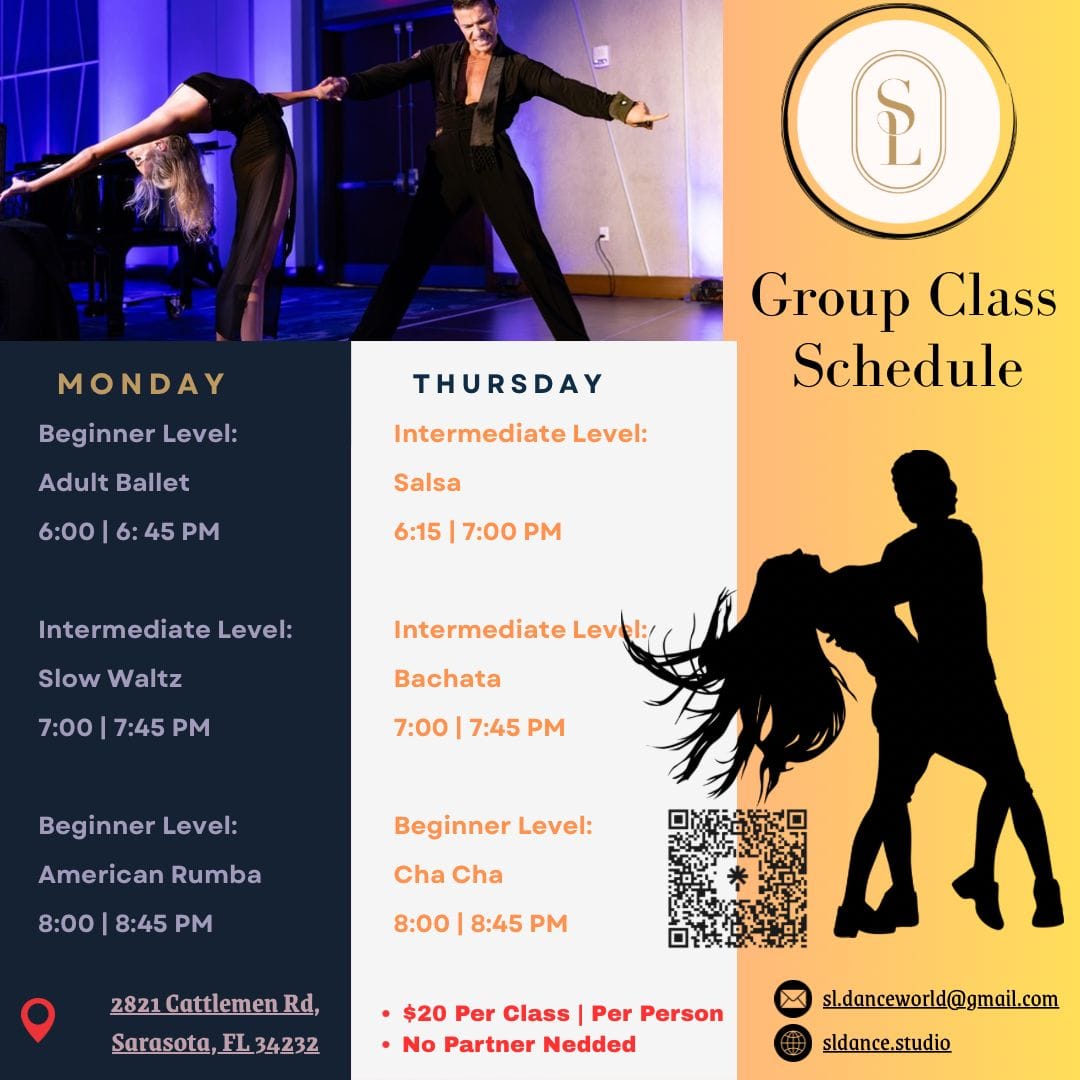 Come inside to beat the heat for these exciting group classes in July. Every Monday and Thursday at 2821 Cattleman Road in Sarasota, we're featuring the best of adult ballet, slow waltz, and American rumba on Mondays, plus all the Latin dancing you could ever want on Thursdays!