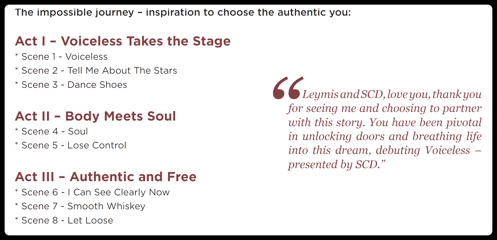 From "Voiceless" to "Letting Loose," John and Sanda have a unique eight-scene production here. It was entertaining and thought-provoking β the type of performance that has you pondering your own journey through life's obstacles.